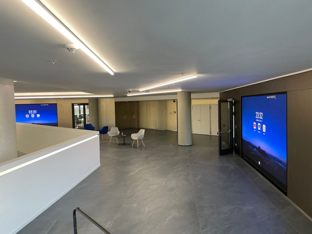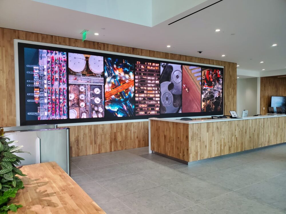To create a modern “WOW” factor when first entering their office lobby, Whitlock with Primeview professional services, deployed two 1×3 arrays of nearly seamless Snello Video Walls.